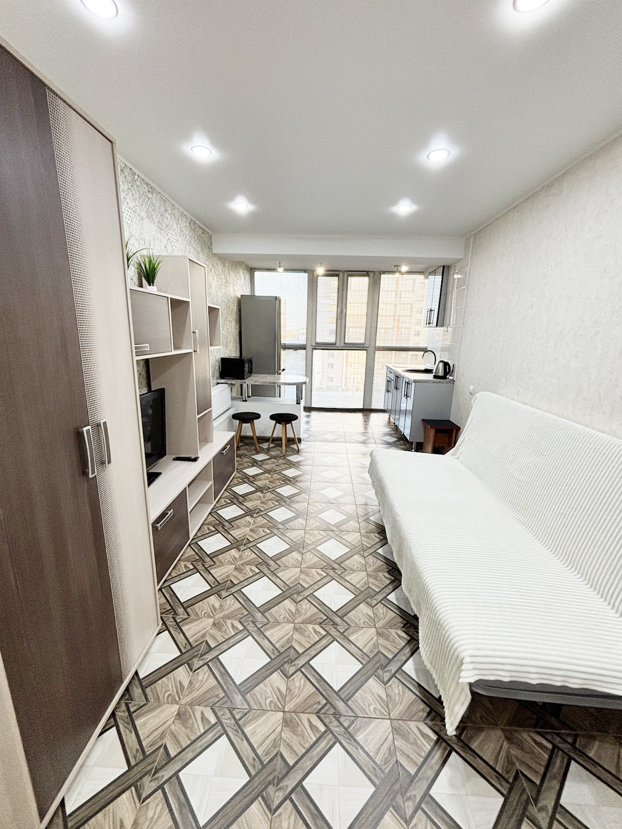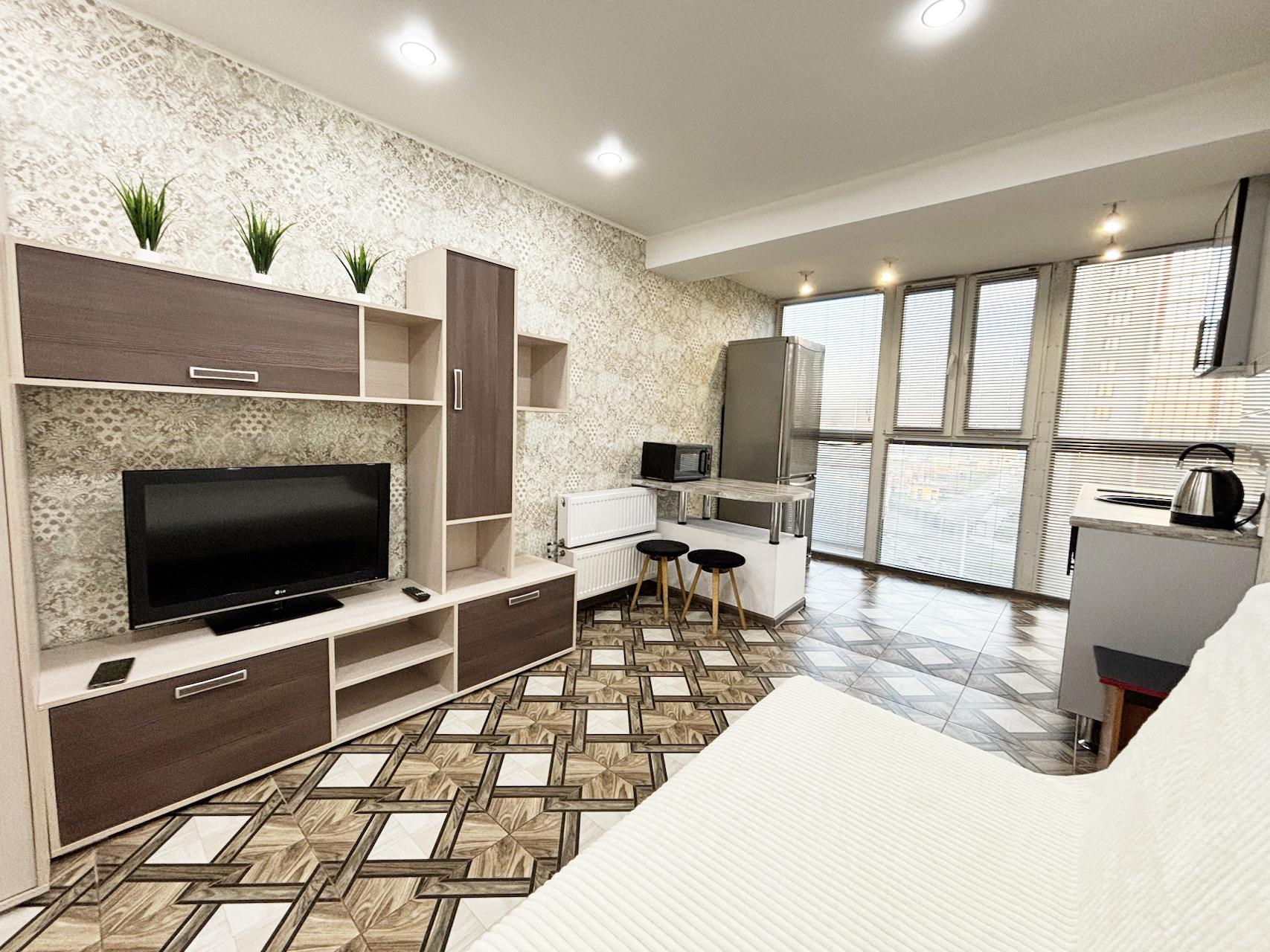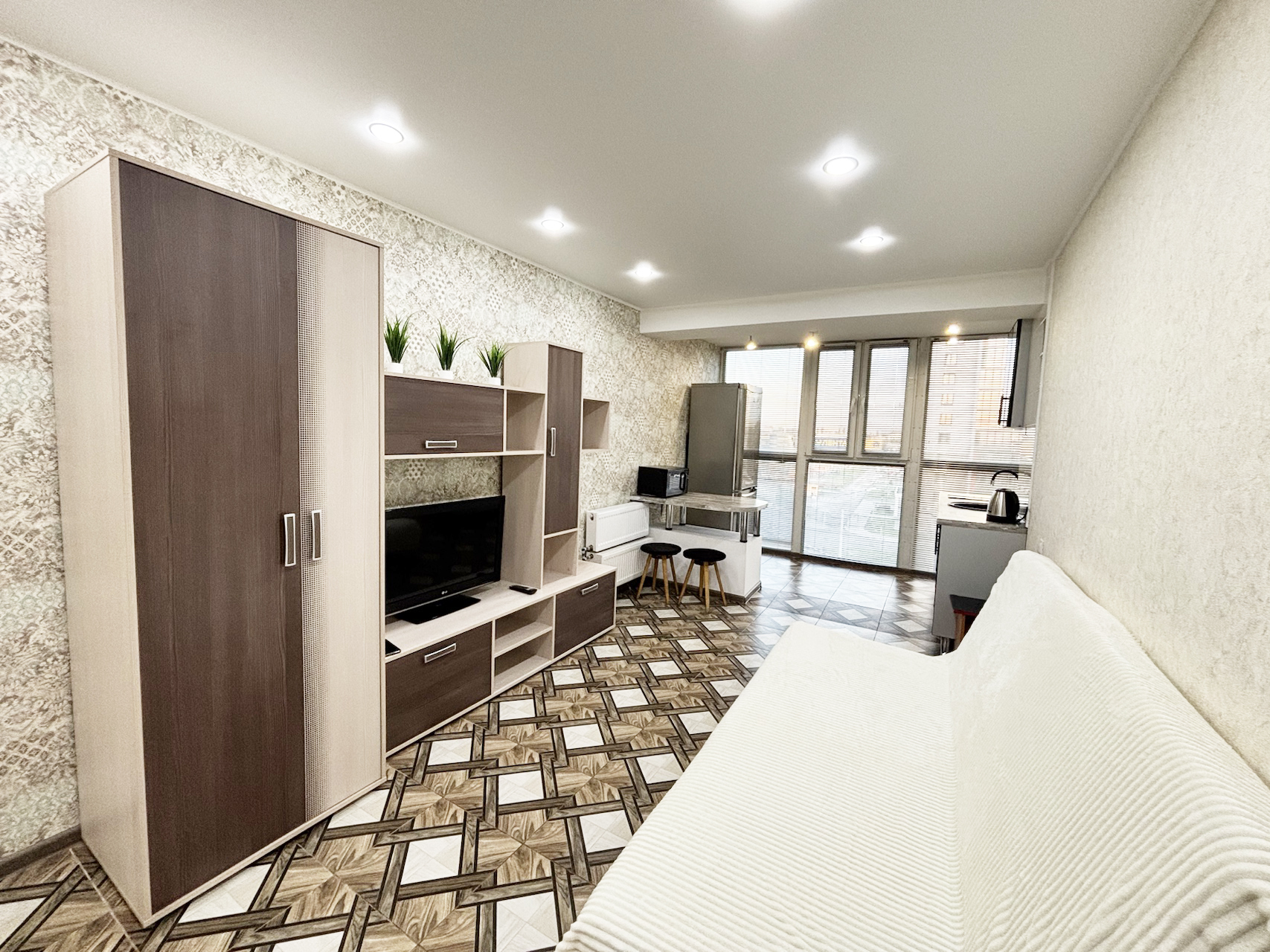 В квартире кухонный гарнитур, плита, микроволновка, чайник, обеденный стол,стулья, диван, тумба под TV, телевизор, отдельная гардеробная, большой холодильник,стиральная машина. В квартире натяжные потолки,комната объединена с лоджией с панорамным остеклением, утепленная металлическая дверь. В доме консьерж, шлагбаум,видеонаблюдение, большая стоянка для автомобилей, игровая площадка для детей+ тренажёры. Остановка в пару минутах ходьбы.