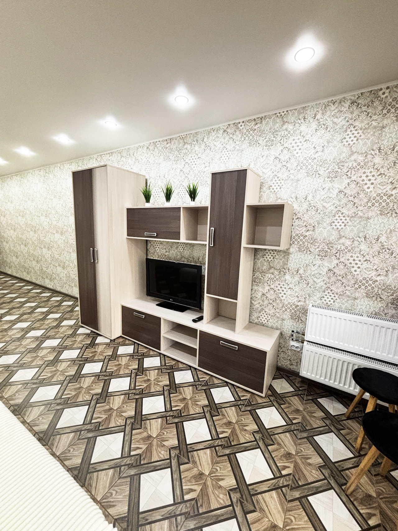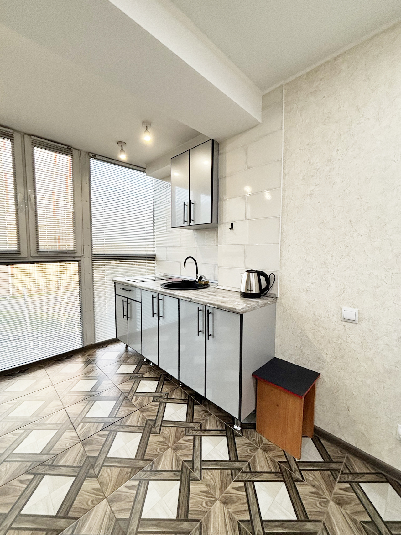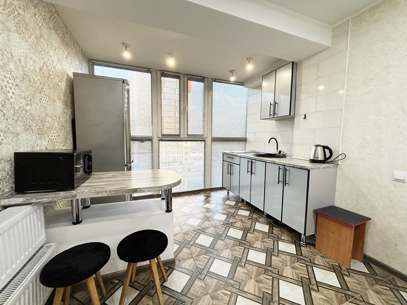 В квартире кухонный гарнитур, плита, микроволновка, чайник, обеденный стол,стулья, диван, тумба под TV, телевизор, отдельная гардеробная, большой холодильник,стиральная машина. В квартире натяжные потолки,комната объединена с лоджией с панорамным остеклением, утепленная металлическая дверь. В доме консьерж, шлагбаум,видеонаблюдение, большая стоянка для автомобилей, игровая площадка для детей+ тренажёры. Остановка в пару минутах ходьбы.